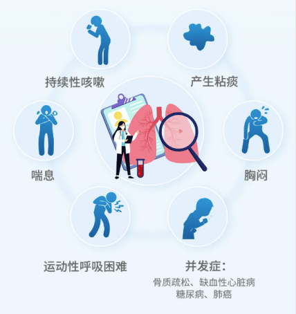 常见的症状有慢性咳嗽、咳痰、气短或呼吸困难等,早期仅在体力劳动时出现,而后逐渐加重,甚至休息时也有气促。活动后呼吸困难是慢阻肺的“标志性症状”。